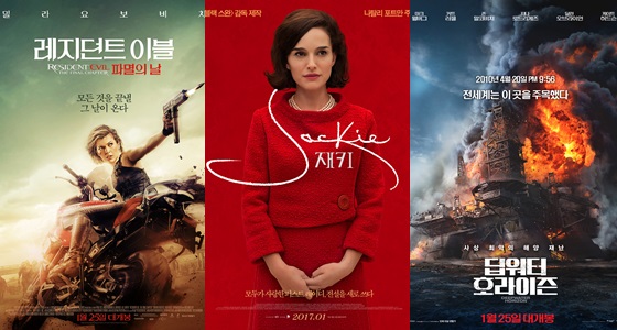 설 연휴를 앞둔 극장가 '더 킹' '공조' 등 한국 영화가 쌍끌이 흥행을 이끈 가운데, 외화 기대작들이 동시에 개봉한다. 밀라 요보비치의 '레지던트이블' 마지막 시리즈 '레지던트이블: 파멸의 날'을 비롯해, 나탈리 포트만의 '재키', 실화를 바탕으로 한 '딥워터 호라이즌'등이 관객을 만난다.