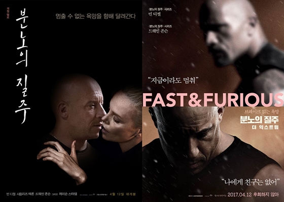 도미닉에게 다가가는 사이퍼의 치명적인 모습에 더해진 '멈출 수 없는 욕망을 향해 달려간다'는 카피가 패러디의 재미를 배가시키고 있다. 함께 공개된 브로맨스 포스터는 도미닉과 홉스(드웨인 존슨 분)를 주인공으로 '캐롤'의 포스터를 패러디해 관심을 모은다. 영화를 설명하는 '브레이크 없는 욕망'이라는 카피가 이미지와 절묘하게 어우러졌으며, 홉스의 "지금이라도 멈춰" 그리고 이와 대조되는 도미닉의 "나에게 친구는 없어"라는 카피는 실제 영화 속 대사를 인용한 것으로 색다른 재미를 더해 보는 이의 웃음을 자아낸다.