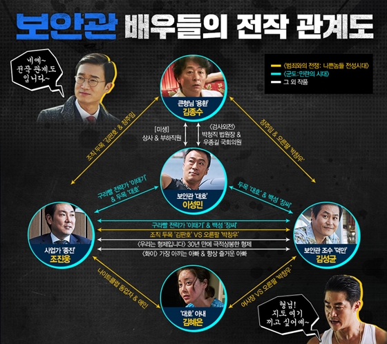 영화 '보안관'(감독 김형주)이 이성민, 조진웅, 김성균 등 주연들이 전작부터 얽히고설킨 만남을 담은 전작 관계도가 공개됐다.