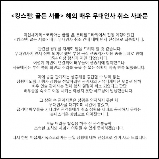 이십세기폭스코리아는 금일 밤 롯데월드타워에서 진행 예정이었던 '킹스맨:골든 서클' 배우 무대인사 취소 건에 대해 진심으로 죄송합니다.