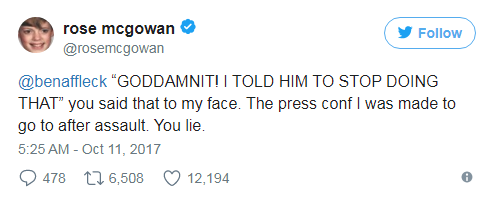 여배우 로즈 맥고완 역시 "거짓말 하지 마라, 당신은 하비에게 그런 일을 하지 말라고 바로 내 앞에서 말한 바 있다. 당신은 거짓말을 했다"고 곧바로 트위터에 반박 글을 올렸다.