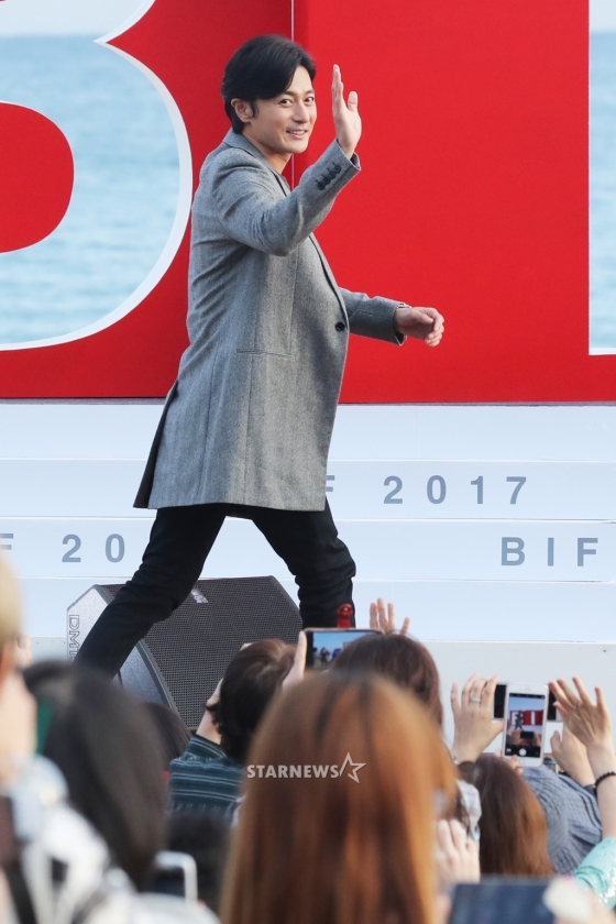 제 22회 부산국제영화제(BIFF) 개막 이틀째 날인 13일 오후 5시10분 부산 해운대 비프빌리지 야외무대에서 '한국영화기자협회와 함께하는 오픈토크-더 보이는 인터뷰 장동건'이 진행됐다. 뉘엿뉘엿 해가 지기 시작하는 해운대를 배경으로 선글라스를 끼고 나타난 장동건 마치 영화의 한 장면처럼 등장했다. 그를 기다리던 영화팬들과 부산 시민들은 환호를 쏟아냈다.