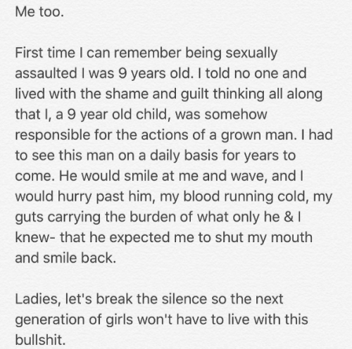 아메리카 페레라는 "내가 가장 먼저 성폭행을 당한 것은 9살 때였다. 아무에게도 말하지 않은 채 치욕과 죄책감을 갖고 살아왔다. 9살짜리 아이로서 성인 남성의 행동에 대한 책임이 있다고 생각했기 때문이다. 그 남자를 매일 매일 보면서 살아왔다. 그는 나를 보고 웃으며 손을 흔들곤 했다. 그럴 때마다 나는 급히 그의 곁을 지나갔다. 그는 내가 입을 다물고 그를 보며 웃어주기를 기대했던 것이다. 여성들이여, 다음 세대의 소녀들은 이러한 거짓과 함께 살아가지 않도록 침묵을 깨자"며 장문의 글을 인스타그램에 올렸다.