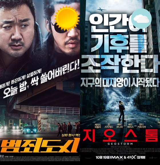 19일 개봉한 할리우드 영화 '지오스톰'은 이번 주말 동안 누적 50만명 이상을 무난하게 달성할 것으로 보인다. '범죄도시'와 '지오스톰'이 1,2위로 10월 셋째 주말 극장가를 쌍끌이하는 가운데 '대장 김창수' '남한산성' 등은 서서히 전열에서 멀어질 것으로 전망된다.
