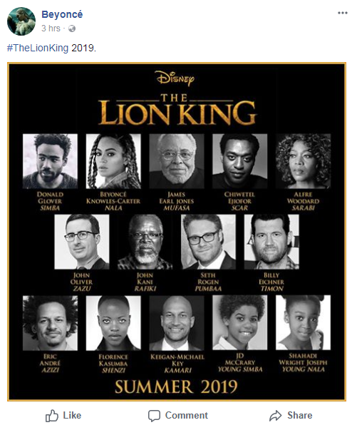비욘세 역시 자신의 페이스북에 출연진 리스트가 담긴 포스터와 함께 #TheLionKing2019 라는 캡션을 달고 포스팅을 올렸다.