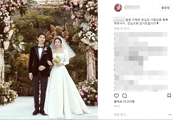 송혜교는 3일 자신의 인스타그램에 "많은 이해와 관심과 사랑으로 축복해주셔서 , 진심으로 감사드립니다"라는 짤막한 글을 올려 고마움을 전했다. 글과 함께 결혼식장에서 송중기와 함께 환하게 웃고 있는 공식 사진을 게재했다.