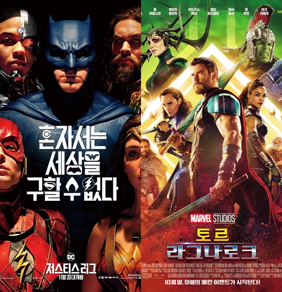 DC의 슈퍼히어로 영화 '저스티스리그'와 마블의 슈피히어로 영화 '토르: 라그나로크'(이하 토르3)의 맞대결이 성사됐다.