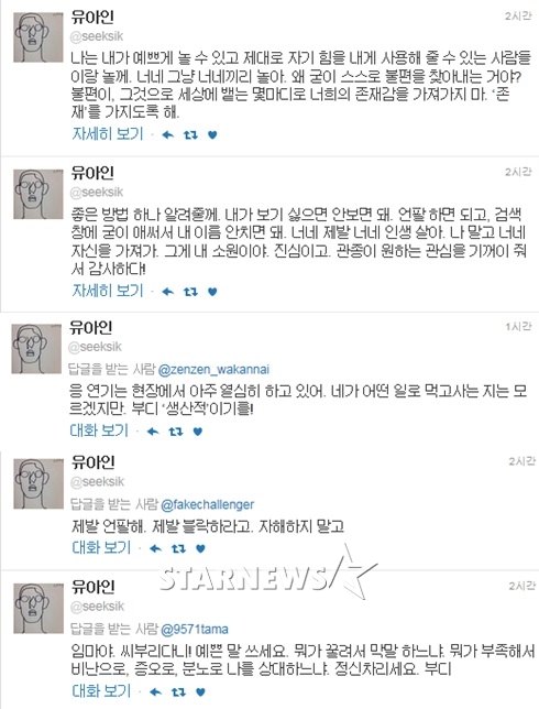 이후 유아인은 자신의 글에 반박하는 네티즌의 트위터에 "언팔 하라고요. 안되는 독해로 해석하느라 고생하지 말고", "제발 언팔해, 제발 블락하라고" 등 감정 섞인 답변을 보내며 눈길을 끌었다.