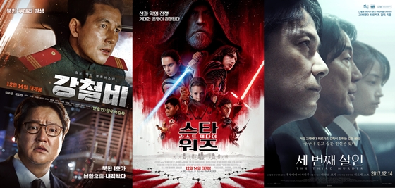 한국, 미국, 일본의 기대작들이 관객들과 만난다. 오는 14일 개봉하는 '강철비', '스타워즈:라스트 제다이', '세 번째 살인' 중 어느 작품이 관객몰이를 시작할지 이목이 쏠리고 있다.