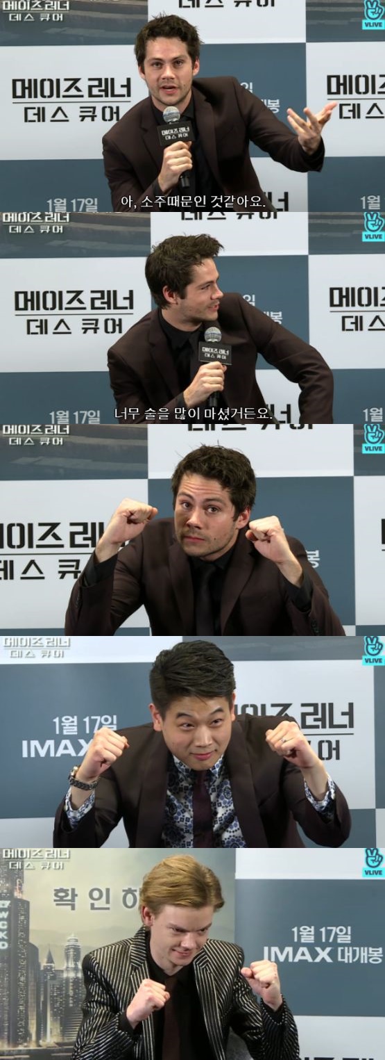 영화 '메이즈 러너 : 데스 큐어'의 세 배우가 소주 때문에 만들어진 포즈를 공개했다.