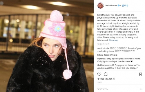 ○...할리우드 벨라 손이 성적으로 학대를 받았다고 주장했다. 그녀는 인스타그램을 통해 자신이 당했던 일을 밝혔다. 이 소식은 지난 8일(현지시간) 미국 매체 E뉴스의 보도로 많은 이들이 관심을 가지게 됐다. 벨라 손은 14세까지 성적으로 물리적 학대를 당했다고 밝혔다. 뿐만 아니라 대중에게 "모두 일어나 학대당한 이들을 돕자"라는 메시지를 전하기도 했다.