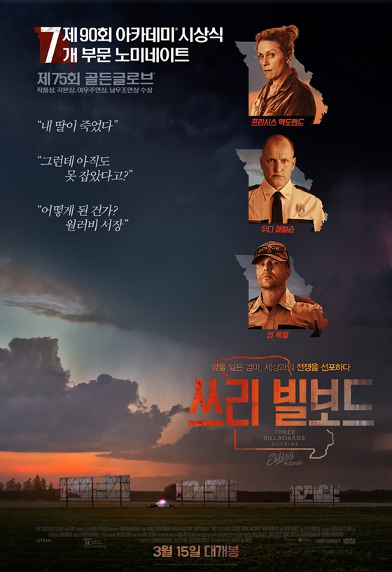 ○...제75회 골든글로브에서 작품상, 각본상, 여우주연상, 남우조연상을 수상한 '쓰리 빌보드'(감독 마틴 맥도나)가 오는 26일 한국에서 언론시사회를 통해 공개된다. '쓰리 빌보드'는 모두가 잊어버린 딸의 살인사건의 범인을 찾기 위해 대형 광고판에 도발적인 메시지로 이목을 집중시켜 세상과 뜨겁게 사투를 벌이는 한 엄마(프란시스 맥도맨드)의 이야기다. 오는 3월 15일 한국에서 개봉한다.