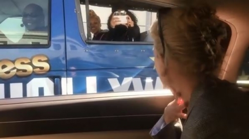 5일 니콜 키드먼은 밴을 타고 오스카로 향하던 중 팬들이 탄 버스를 만났다. 그녀는 창문을 내려 팬들에게 손을 흔들며 인사했다.