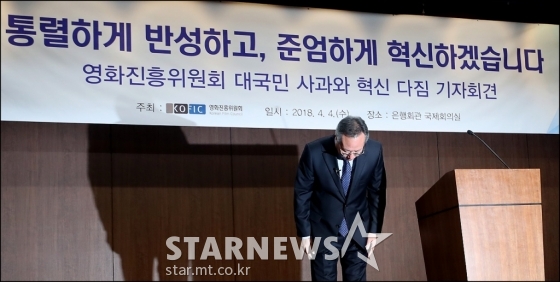 영진위는 4일 오후 서울 은행회관 대회의실에서 '대국민 사과와 혁신 다짐 기자회견'을 열었다. 이날 기자회견에는 오석근 영진위원장과 조종국 사무국장, 김현수 본부장 등이 참석했다.