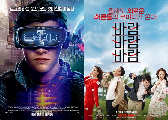 어른들을 위한 코미디 '바람 바람 바람', 스티븐 스필버그의 8090 찬가 '레디 플레이어 원'이 15일 나란히 100만-200만 관객을 돌파한다.