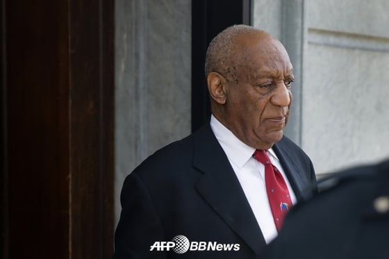 빌 코스비가 26일 미국 몽고메리 카운티 법정에서 성폭행 혐의에 대한 유죄 평결을 받은 이후 침통한 표정으로 법원을 나서고 있다. /AFPBBNews=뉴스1