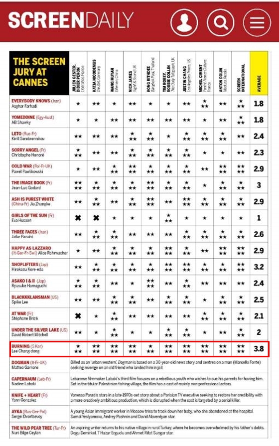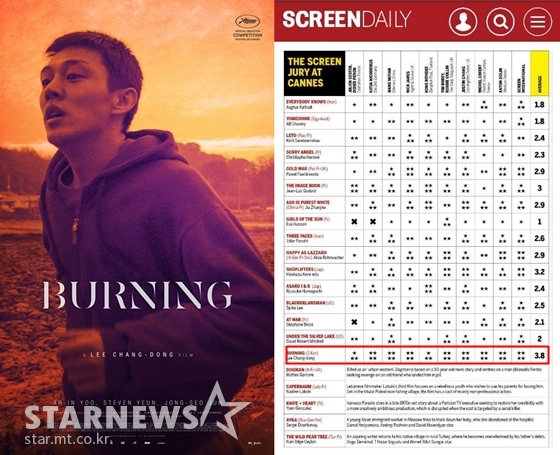 18일(현지시간) 제71회 칸국제영화제 공식 데일리를 발간하는 스크린의 경쟁부문 초청작 평점 집계 결과 '버닝'이 4점 만점에 3.8점에 해당하는 역대 최고점을 기록했다.