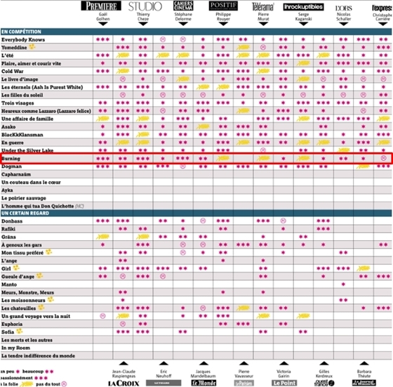 다만 평점마다 온도차는 있다. 유럽 15개 매체의 평점을 싣는 르필름프랑세즈의 평점에서는 '버닝'이 중위권에 해당하는 평점을 받았다.
