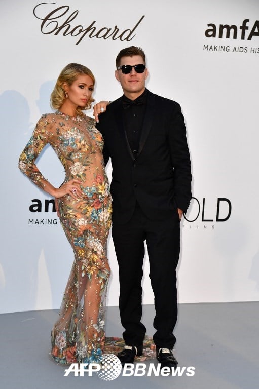 이날 패리스 힐튼은 약혼자로 알려진 크리스 질카와 함께 포토월에 섰다. 패리스 힐튼은 꽃 무늬가 새겨진 드레스를 입고 등장했다. 모도 다이아몬드가 달린 이 화려한 의상은 주요 부위를 가린 채 속살이 그대로 비추었다.