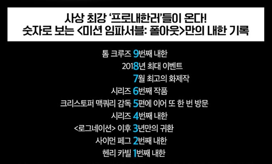 1996년 1편부터 주인공이자 제작자로 '미션 임파서블'과 함께해 온 톰 크루즈는 '미션 임파서블' 시리즈로만 4번째 내한하게 됐다. 그간 '미션 임파서블 2'은 오우삼 감독, '미션 임파서블: 고스트 프로토콜'은 폴라 패튼과 브래드 버드 감독, '미션 임파서블: 로그네이션'은 크리스토퍼 맥쿼리 감독, 제작자 브라이언 버크와 내한을 함께했다.