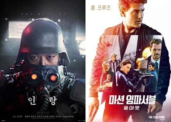 ○...영화 '인랑'(감독 김지운)과 할리우드 영화 '미션임파서블 : 폴 아웃'(감독 크리스토퍼 맥쿼리)이 25일 동시에 개봉한다. 두 영화가 한날 개봉하며 영화에 대한 기대도 높아지고 있다. 특유의 섬세한 미쟝센을 내세운 김지운 감독의 SF 액션과 '몸으로 뛰는' 톰 크루즈의 액션 중 관객의 선택은 어떤 영화가 될지 두 영화의 맞대결에 관심이 집중 된다.