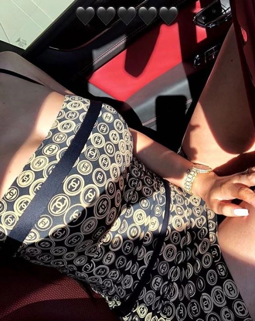 거울 속 카일리 제너가 입은 것은 어깨끈이 없는 샤넬미니드레스이다. 출산 후 5개월 밖에 지나지 않았음에도 불구하고 잘록한 허리와 탄탄한 어깨선을 자랑하고 있다.