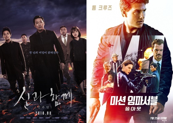 '미션임파서블 : 폴아웃'이 개봉후 7일째 1위를 지키며 흥행가도를 달리는 가운데 영화 '신과함께-인과연'(감독 김용화)가 개봉하며 여름 극장가 판도 변화에 관심이 집중된다.