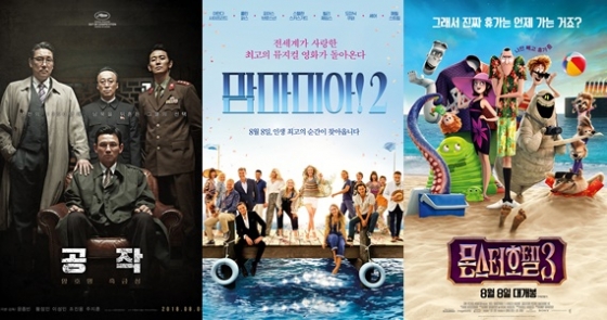 영화 '신과함께-인과연'이 여름 극장가를 강타한 가운데, 또 다른 기대작 '공작'이 개봉한다. 또 10년만에 돌아온 '맘마미아!2'와 애니메이션 '몬스터 호텔3'가 찾아온다.