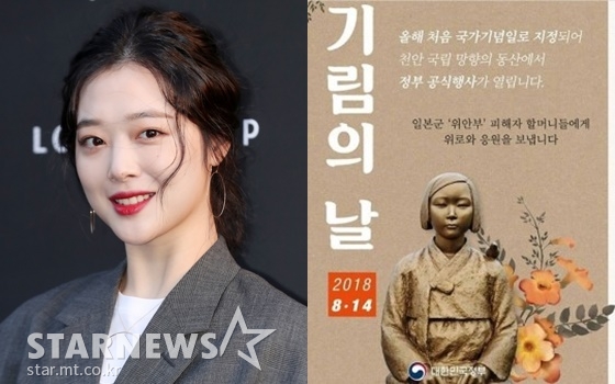 걸그룹 f(x) 멤버 출신 배우 설리(본명 최진리)가 위안부 '기림의 날' 포스터를 올려 응원을 받고 있다.
