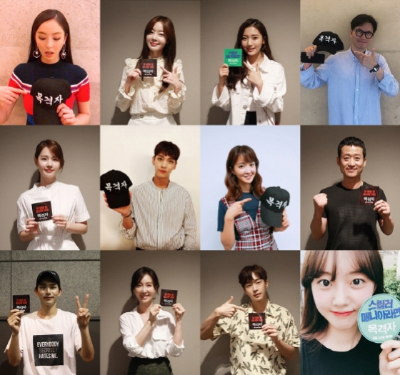공개된 사진에서 배우들은 목격자 홍보 스티커와 모자를 들고 미소부터 파이팅을 외치는 포즈, 목격자를 지목하는 포즈 등 각기 다른 응원으로 독려샷을 남겼다.