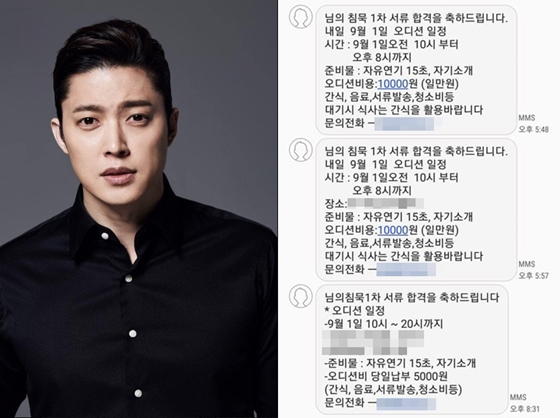 해당 문자에는 "영화 '님의 침묵' 1차 서류 합격을 축하드린다"는 문구와 함께 오디션 장소, 일정 등이 적혀 있다. 특히 "오디션 비용 1만원"이라며 "간식, 음료, 서류발송, 청소비 등. 대기시 식사는 간식을 활용바랍니다"라는 문구가 함께 담겼다. 몇시간 뒤 "오디션비 당일납부 5000원"으로 수정된 문자가 다시 발송된 모습이다.