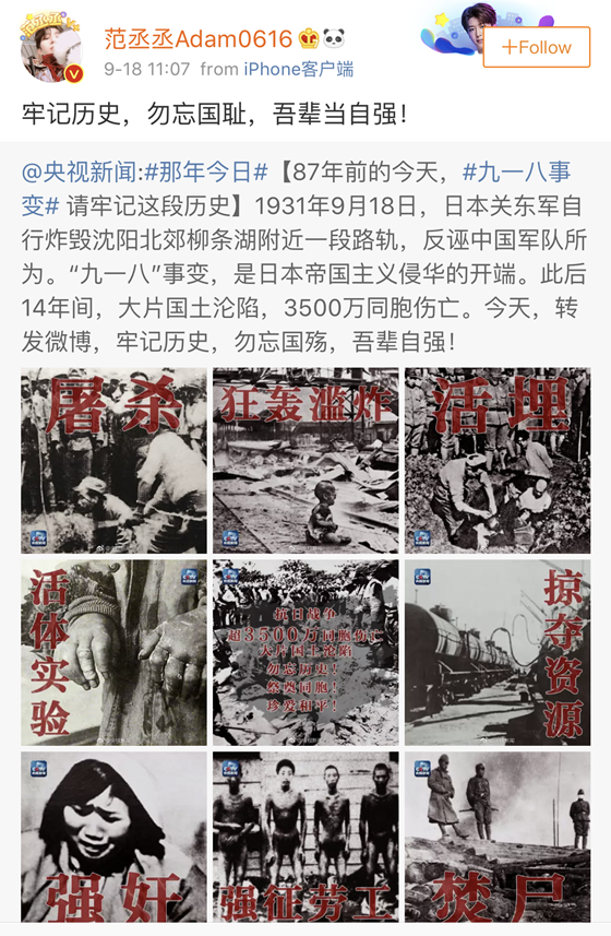 판청청은 지난 18일 자신의 개인 웨이보에 9.18사변(만주사변) 당시 일본군의 만행을 되새기는 중국 CCTV의 게시물을 리트윗했다. 판청청은 이와 함께 "역사를 마음 깊이 새기자. 나라의 치욕을 잊지 말자. 스스로 더욱 강해지자"라는 문구를 함께 담았다. 팬미팅 이후 SNS 활동을 잠시 쉬던 판청청이 지난 6일 이후 12일 만에 SNS 활동을 재개한 셈이라 더 눈길을 모았다.