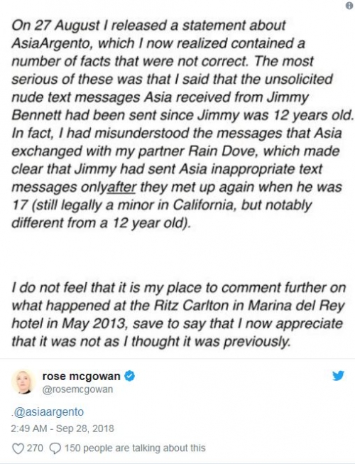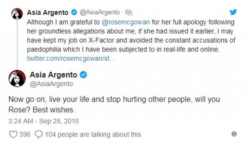 로즈 맥고완의 사과 후 아시아 아르젠토는 "근거없는 비난 후 진심으로 그녀가 사과를 한 것에 대해 고맙게 생각한다. 그러나 만약 사과를 더 일찍 했더라면 나는 '엑스팩터' 프로그램에서도 하차하지 않았을 것이며, 소아성애자라는 비난도 듣지 않았을 것이다"고 전했다. 또한 "이제 너의 삶을 살고 다른 사람에게 상처주는 것을 멈춰라"고도 덧붙였다.