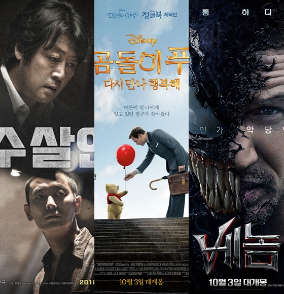 추석 극장 대첩이 '안시성'의 승리로 끝난 가운데 10월 3일 개천절과 10월 9일 한글날 연휴를 노린 영화들이 대거 개봉한다. '암수살인'과 '곰돌이 푸 다시 만나 행복해' '베놈'이 관객을 만날 준비를 갖췄다.