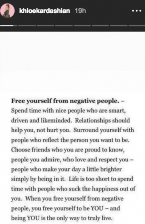또한 클로에는 SNS에 "부정적인 사람으로부터 멀어져라. 관계란 당신을 아픈게 하는 게 아니라 도움을 주어야 하는 것이다. 좋은 사람을 옆에 두어라" 의 글을 올리면서 의혹은 더욱 커지고 있다.