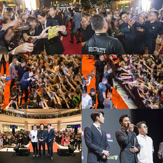 이에 화답하듯 현빈과 장동건은 약 1시간 동안 셀카는 물론, 악수, 포옹, 사인 등 역대급 팬서비스를 선보이며 역대 선텍시티몰 레드카펫 행사 중 가장 오랜 시간 팬들과 교감하는 놀라운 기록을 일궈내기도 했다. 특히 이러한 뜨거운 현장은 네이버 V앱을 통해 생중계되며 국내팬들도 현장의 열기를 체감할 수 있었다. 이후 RWS 극장(Resort World Sentosa Theatre) 로비에서도 관객들과의 짧은 만남 이후 갈라 프리미어 무대인사를 진행했다.