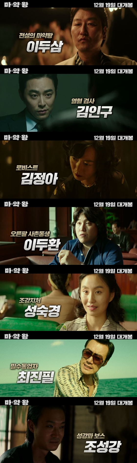 함께 공개된 캐릭터 예고편에선 이들의 활약상을 엿볼 수 있다. 자신의 일이 애국이라 믿으며 하급 밀수업자에서 전설의 마약왕으로 거듭나는 이두삼(송강호), 그를 집요하게 쫓는 열혈 검사 김인구(조정석), 마약왕의 잠재력을 알아본 로비스트 김정아(배두나), 마약왕의 일에 동참한 순진한 사촌동생 이두환(김대명), 남편의 행보를 예민하게 지켜보는 조강지처 성숙경(김소진), 마약왕의 밀수 동업자 최진필(이희준), 수출 활로를 열어준 조직 성강파 보스 조성강(조우진) 등의 모습이 담겼다.