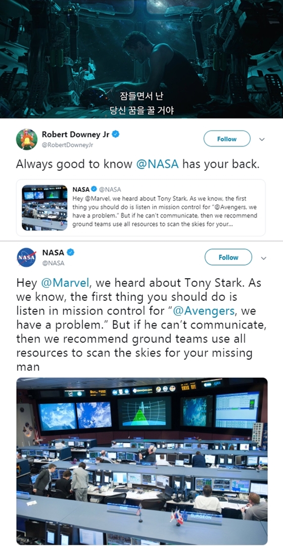 '어벤져스4' 팬들의 아이언맨 구조요청에 나사(NASA)가 응답했다. 나사의 응답에 이번엔 로버트 다우니 주니어가 화답했다.