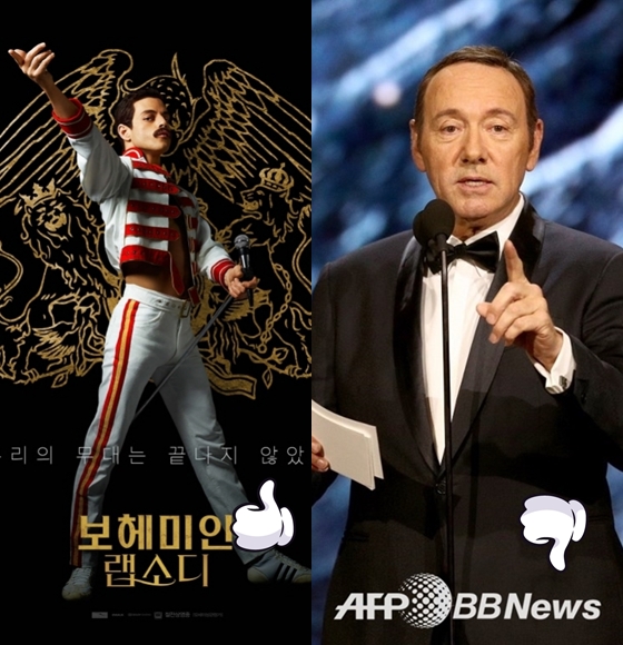 '보헤미안 랩소디'가 2018년 마지막 주말 900만명을 돌파하는 반면 케빈 스페이시가 18세 소년 성추행 혐의로 기소됐다/사진='보헤미안 랩소디' 포스터,AFPBBNews=뉴스1