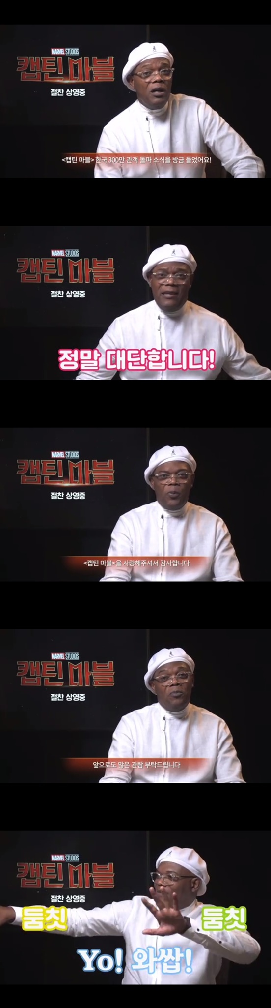 사무엘 L 잭슨은 덩실덩실 어깨춤을 추며 300만 돌파를 축하했다. 잭슨은 "'캡틴마블' 한국 300만 관객 돌파 소식을 지금 막 들었다"라며 "정말 대단하다. '캡틴마블'을 사랑해 주셔서 감사하다. 이 순간을 함께 할 수 있어 기쁘다. 앞으로도 많이 사랑해 달라"고 전했다.