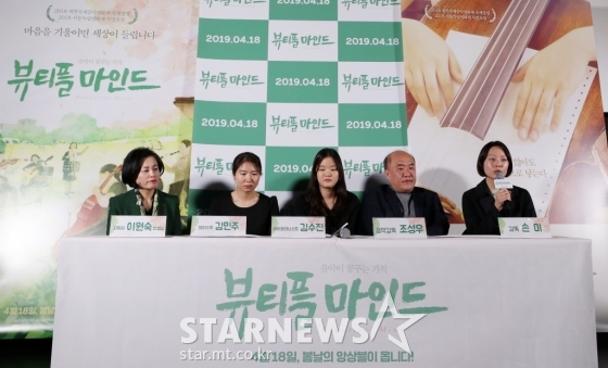 지휘자 이원숙, 첼리스트 김민주, 바이올리니스트 김수진, 음악감독 조성우, 손미 감독이 9일 오후 서울 광진구 롯데시네마 건대입구에서 진행된 영화 '뷰티플 마인드(감독 손미)' 언론시사회 및 기자간담회에 참석해 질의응답을 하고 있다.