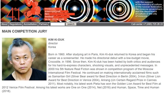 11일 모스크바국제영화제는 홈페이지를 통해 올해 영화제 경쟁부문 심사위원 명단을 공개했다. 이에 따르면 김기덕 감독은 경쟁 부문 심사위원장을 맡는다. 영화제 측은 "김기덕 감독은 '악어'로 데뷔한 이래 표현하기 어려운 캐릭터, 충격적인 비주얼, 새로운 메시지로 비평가들과 관객 양쪽에 호평을 받았다"라고 소개했다.