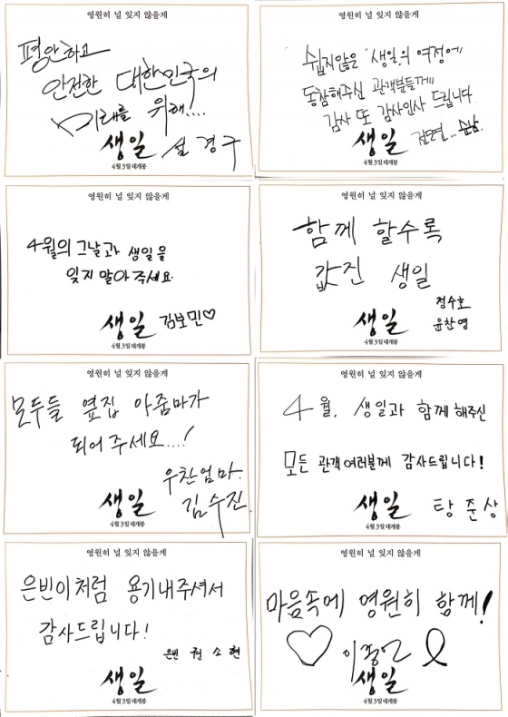 설경구는 "평안하고 안전한 대한민국의 미래를 위해", 전도연은 "쉽지 않은 '생일'의 여정에 동참해주신 관객 분들께 감사 또 감사 인사 드립니다"고 전했다. 김보민은 "4월의 그날과 '생일'을 잊지 말아주세요"라고 전했고 윤찬영은 "함께 할수록 값진 '생일'", 김수진은 "모두들 옆집 아줌마가 되어주세요!", 탕준상은 "4월, '생일'과 함께 해주신 모든 관객 여러분께 감사 드립니다", 권소현은 "은빈이처럼 용기 내주셔서 감사합니다"라며 감사의 인사를 전했고, 이종언 감독은 "마음 속에 영원히 함께!"라고 진심을 표했다.
