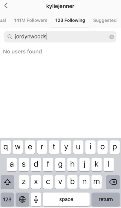현재 카일리 제너는 조딘 우즈를 계정을 팔로잉 리스트에서 삭제한 상태이다.
