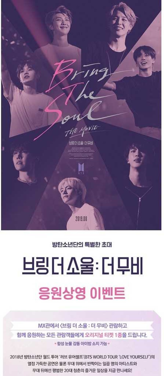 글로벌 아이돌 그룹 방탄소년단의 새로운 영화 '브링 더 소울 : 더 무비'가 오는 8월 7일 전 세계 동시 개봉을 앞둔 가운데, 메가박스가 MX 응원 상영회를 연다.