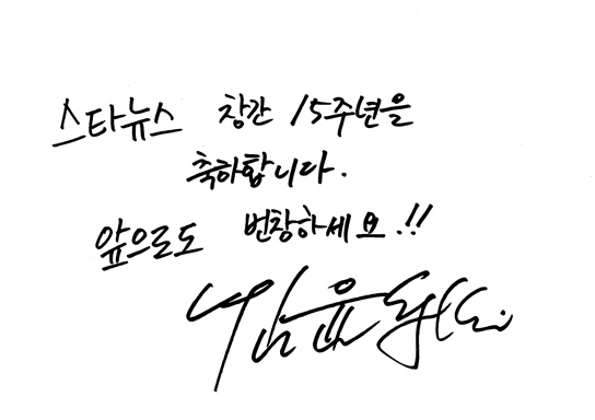 영화배우 김윤석은 "스타뉴스 창간 15주년 축하드립니다. 앞으로도 번창하세요"라며 "앞으로도 즐거운 뉴스, 좋은 뉴스 부탁드립니다"라고 전했다.