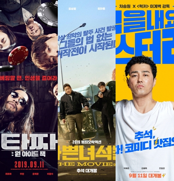 올 추석 극장가는 연휴가 짧은 데다 세 편의 한국영화가 같은 날 격돌, 성패를 점치기가 쉽지 않다. '타짜: 원 아이드 잭'이 예매율과 인지도에서 가장 높지만 청소년 관람불가 등급이고, '나쁜 녀석들: 더 무비'는 원작과 마동석의 인기에 힘입어 선호도가 높지만 완성도가 떨어진다. '힘을 내요, 미스터리'는 12세 이상 관람가 등급이라 추석 극장 가족 나들이에 적격이지만 인지도가 가장 낮다.