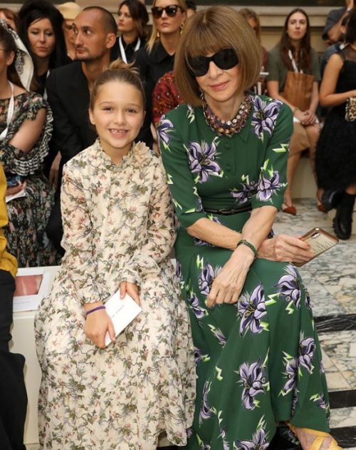 엄마 아빠의 외모를 닮은 소녀는 이날 플로럴 프린트의 원피스를 입고, 패셔니스타의 면모를 과시하며, 맨 앞줄에서 엄마의 쇼를 감상했다. 바로 옆자리는 보그 편집장이자 '악마는 프라다를 입는다'의 실존인물 안나 윈투어였다.