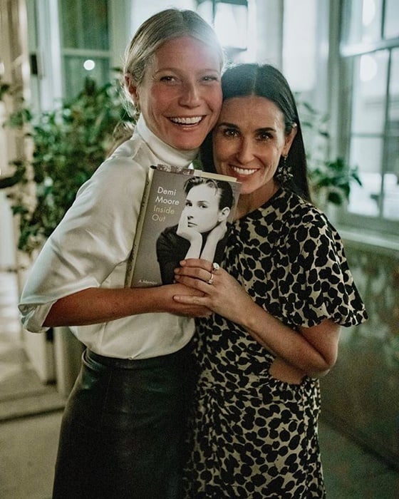 공개된 사진 속 데미 무어는 기네스 펠트로와 함께 자신의 자서전인 '인 사이드 아웃'을 들고 함께 미소를 짓고 있는 모습이다.