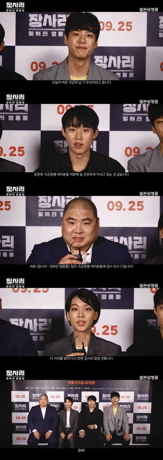에이스 학도병 기하륜을 연기한 김성철은 "든든한 국군장병 여러분들 덕분에 늘 안전하게 지내고 있는 것 같습니다"라고 말했고 학도병 국만득으로 분한 장지건은 "저희 '장사리 : 잊혀진 영웅들' 팀이 국군장병 여러분들께 감사 인사 드립니다"라고 전했다.